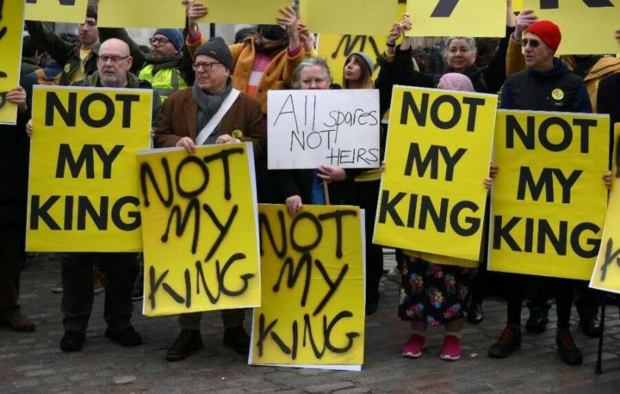 Monarşi karşıtları, ellerinde "Benim kralım değilsin", "ırkçı kraliyet ailesi" yazan pankartlar taşıdı.