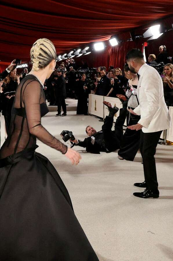 Lady Gaga'yı arkadan gören Oscar fotoğrafçısı yere çakıldı
