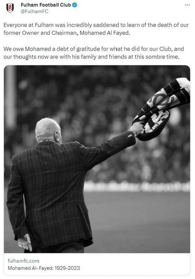 Fulham futbol kulübü dün yaptıkları açıklamada "Fulham'daki herkes, eski Sahibimiz ve Yönetim Kurulu Başkanımız Mohamed Al Fayed'in ölümünü öğrendiğinde inanılmaz derecede üzüldü. Kulübümüz için yaptıklarından dolayı Mohamed'e şükran borçluyuz ve bu kasvetli zamanda düşüncelerimiz artık onun ailesi ve arkadaşlarıyla birlikte" ifadelerine yer verdi.