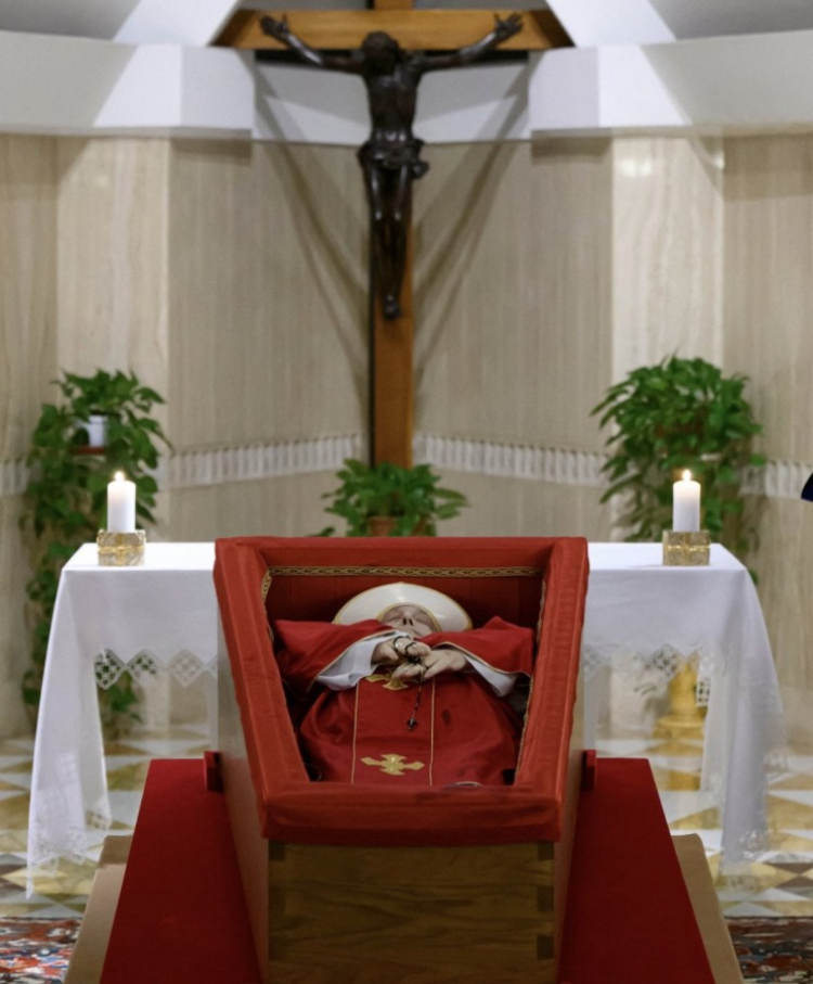 Papa Francis'in naaşı, bugün Vatikan'da düzenlenen ve Papa'nın ölümünün onaylandığı tören için açık tabutun içine konuldu.