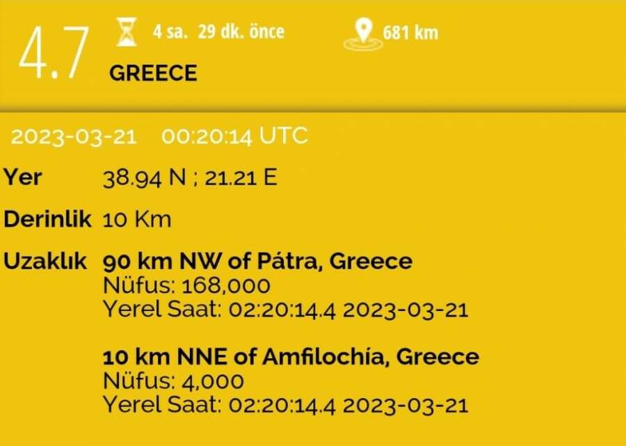 Yunanistan'da 4.7 büyüklüğünde bir deprem meydana geldi.