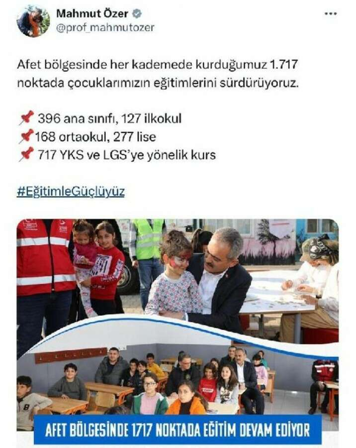 Bakan Özer, Twitter'daki hesabından yaptığı açıklamada, "Afet bölgesinde her kademede kurduğumuz 1717 noktada çocuklarımızın eğitimlerini sürdürüyoruz" dedi.