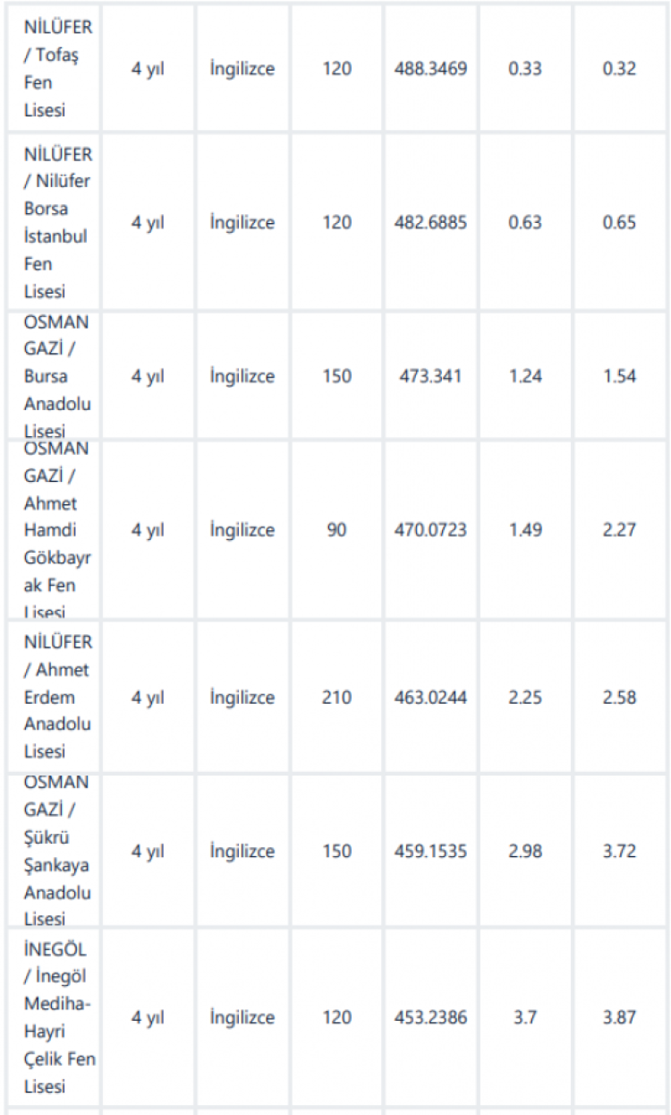 İşte geçtiğimiz yıla ilişkin Bursa liseleri taban puanları, yüzdelik dilimleri ve kontenjanları;