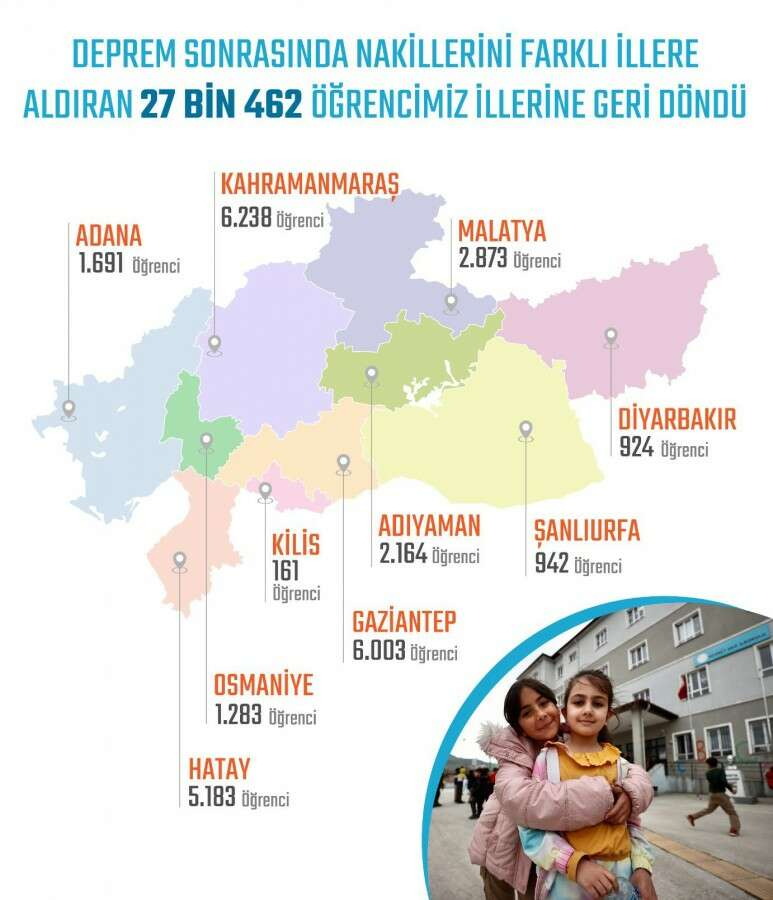 "Evlatlarımızın yarınlara daha güvende bakması için afet bölgesinde tüm imkânlarımızla eğitimi normalleştirmeye devam ediyoruz. Nakillerini diğer illere aldıran öğrencilerimizden 27 bin 462'si okullarına geri döndü. Eğitim varsa umut hep var..."