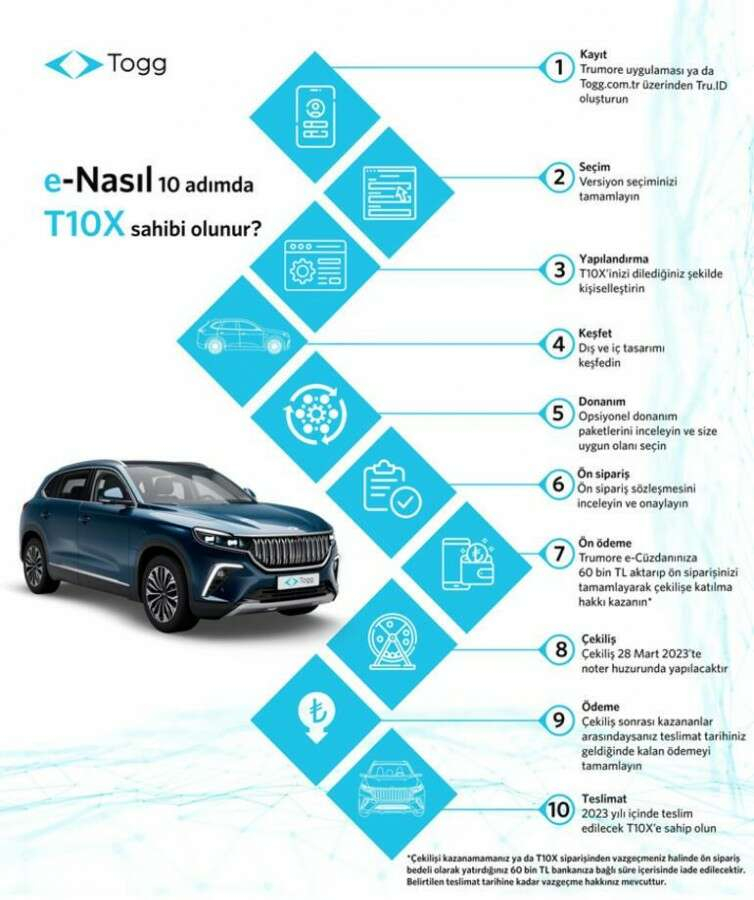 Bu süreçte Trumore uygulamasından veya Togg websitesi üzerinden Tru.ID oluşturan her bir tekil kullanıcı, havale ya da kredi kartı aracılığıyla Trumore e-Cüzdan'a 60 bin TL'yi aktardıktan sonra ön sipariş vermek istedikleri T10X'i konfigüre edip ön ödemeyi yaparak çekilişe katılmaya hak kazanacak.