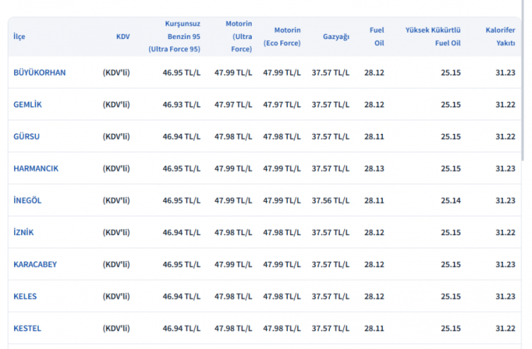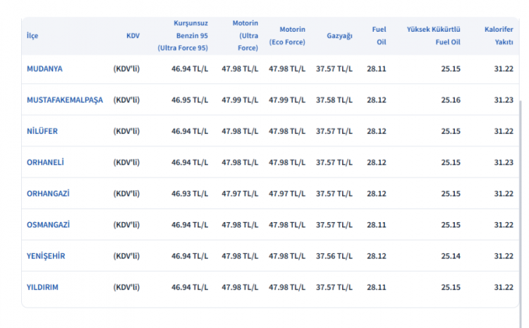 İşte 30 Ocak 2025 Perşembe gününe ilişkin güncel akaryakıt fiyatları:Bursa akaryakıt fiyatları