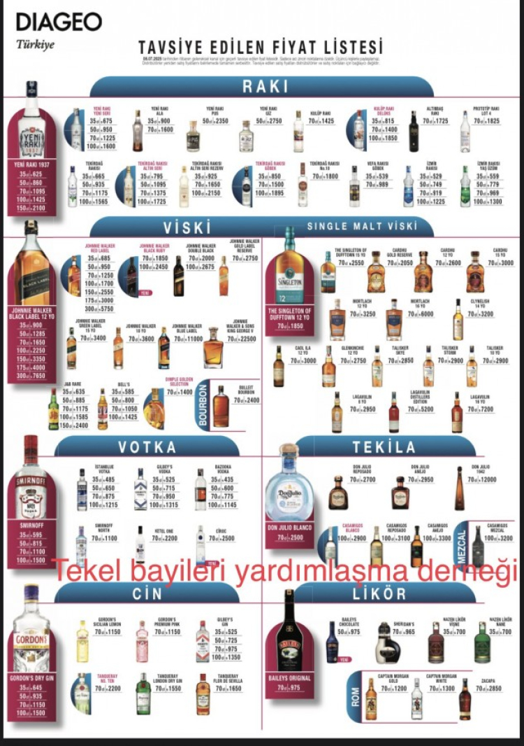 Tekel Bayileri Yardımlaşma Derneği Başkanı Erol Dündar yaptığı sosyal medya paylaşımında, bir alkol grubunda yer alan rakı, votka, viski, cin ve liköre zam geldiğini duyurdu.