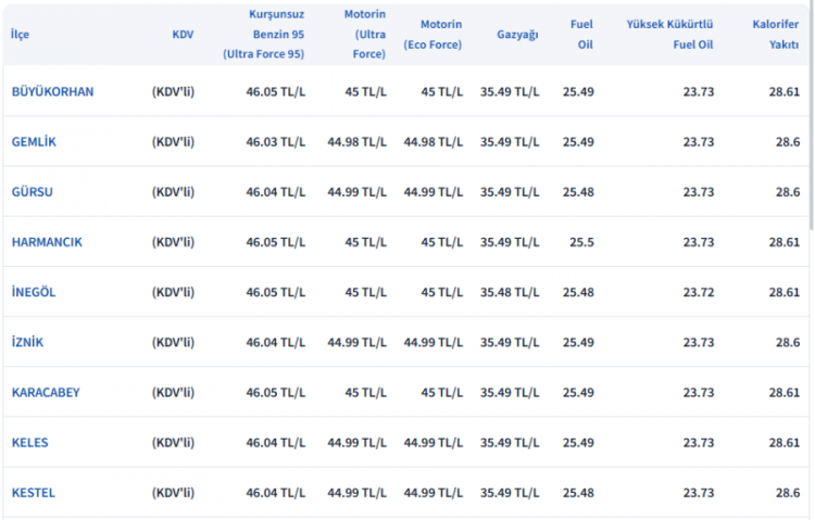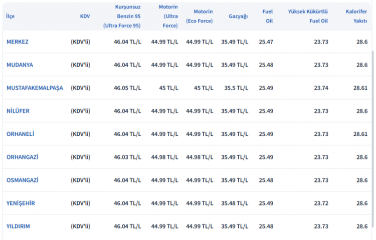 Bursa Akaryakıt Fiyatları: