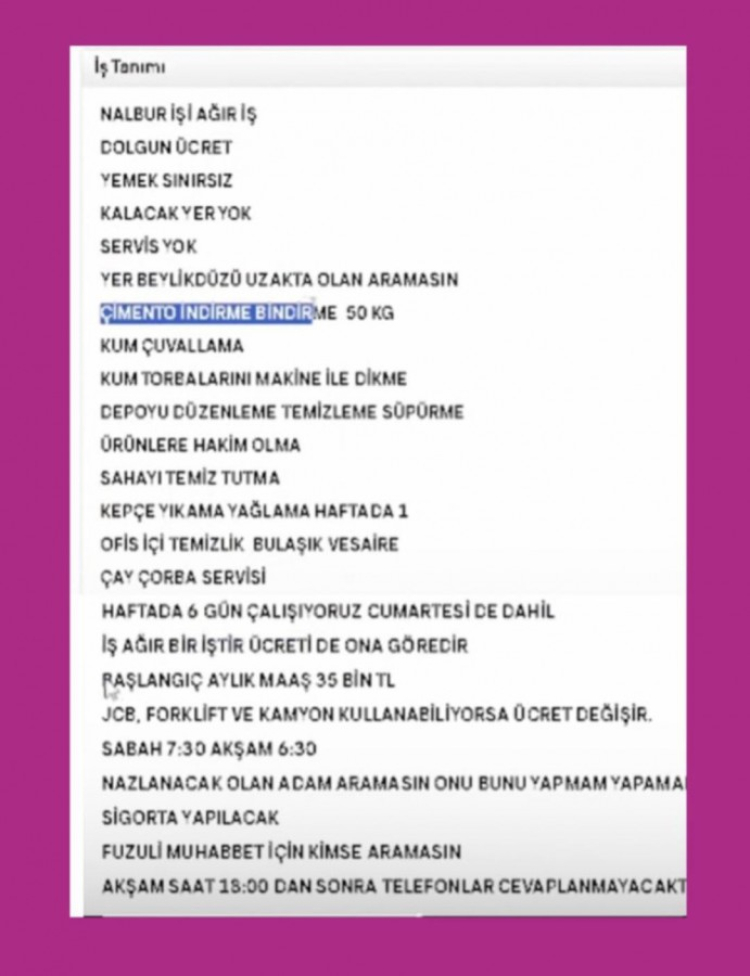 Beylikdüzü'nde bulunan bir iş yerinin iş ilanı sosyal medyada gündem oldu. Dolgun ücret vereceğini iddia eden iş yeri sahibi alacağı elemandan; çimento taşımasını, depo düzenlemesini, kum çuvallamasını ve bu çuvalı dikmesini, temizlik yapıp bulaşık yıkmasını, çay çorba servisi yapmasını, kepçe yıkama yağlama yapmasını istedi. Haftanın 66 saat çalışacak işçiye yol ve yemek de vermeyen işveren dolgun maaş olarak da 35 bin lira önerdi. Not olarak ise "Nazlanan aramasın" dedi. İşte detaylar...