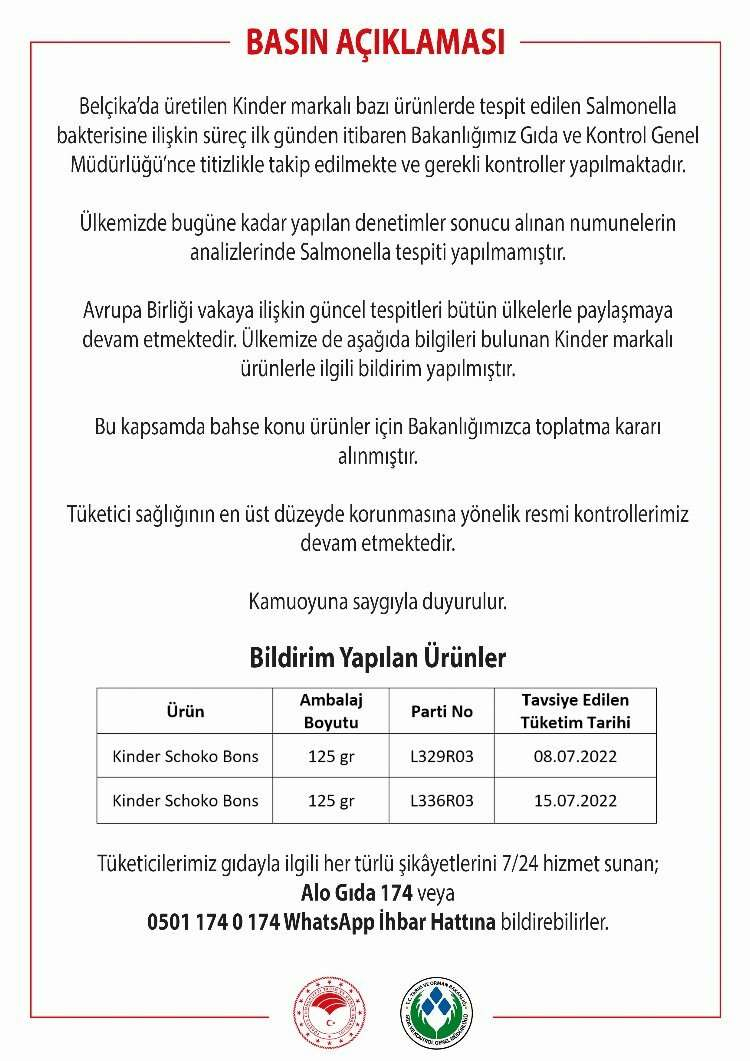 Tarım ve Orman Bakanlığı, Kinder markalı Schoko Bons ürününün iki partisi için toplatma kararı aldı. Toplatılacak ürünlerin son tüketim tarihleri 8-15 Temmuz 2022.