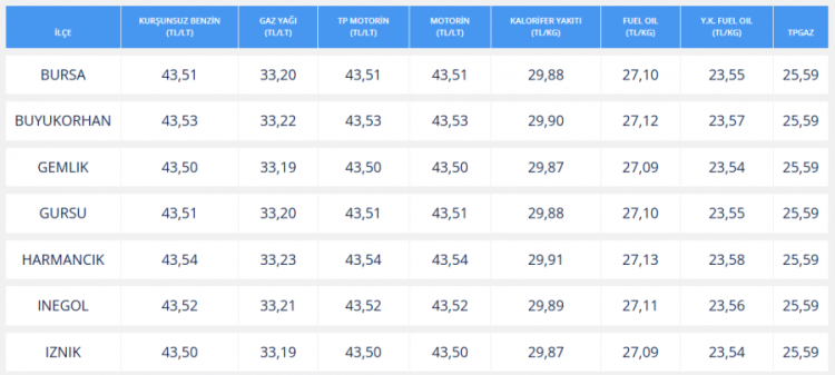BURSA'DA GÜNCEL AKARYAKIT FİYATLARI