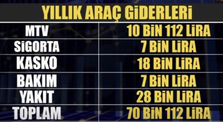Yıllık araç giderleri hesaplandığında kaskoya 18 bin lira, bakıma 7 bin lira, yakıta ortalama 28 bin lira ödenmesi gerekiyor. Bunların da toplamı yılda 70 bin 11 lira tutuyor. Yani en uygun aracın yılda bir sürücüye maliyeti 70 bini geçmiş oluyor.