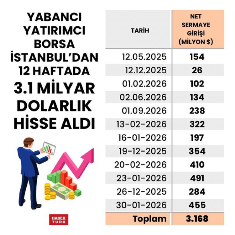 Yabancı yatırımcının Borsa İstanbul'a ilgisi kesilmiyor. En son 1 Aralık haftasında net 9 milyon dolarlık küçük bir satış yapan yabancılar sonraki 12 haftada İstanbul borsasından 3 milyar 168 milyon dolarlık hisse senedi aldı. Yabancı yatırımcı borsanın yüzde 3.4 düştüğü son 2 gün yoğun satışların olduğu 20 Şubat haftası (geçen hafta) bile 410 milyon dolarlık alım yaptı.