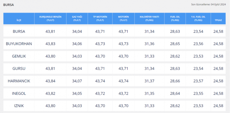 Gece yarısından itibaren geçerli olmak üzere LPG'ye 1,30 TL zam geldi. Peki Bursa'da 4 Eylül 2024 benzin, motorin, LPG fiyatları ne kadar, güncel akaryakıt fiyatları kaç TL?