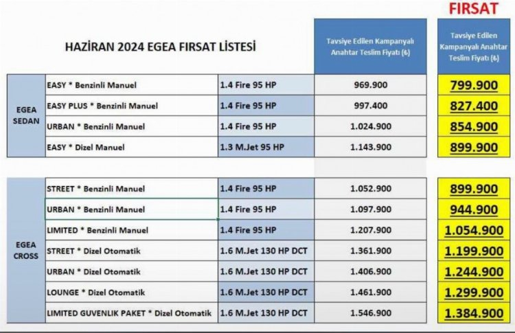 Mayıs ayında otomobil satışlarında 5.sıraya kadar gerileyen Fiat, Haziran'da Egea modelinde 245 bin TL'yi bulan indirimleri devreye soktu. En ucuz Egea'nın fiyatı 799.900 TL'ye indi.