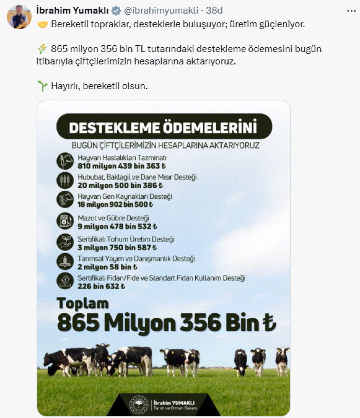 Bakanlık bu kapsamda, çiftçilere destek ödemesinde bulunuyor.Tarım ve Orman Bakanı Yumaklı, sosyal medya hesabından yaptığı paylaşımda, son destekleme ödemelerine ilişkin bilgi verdi.
