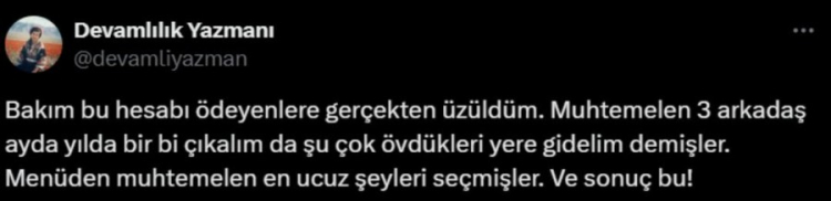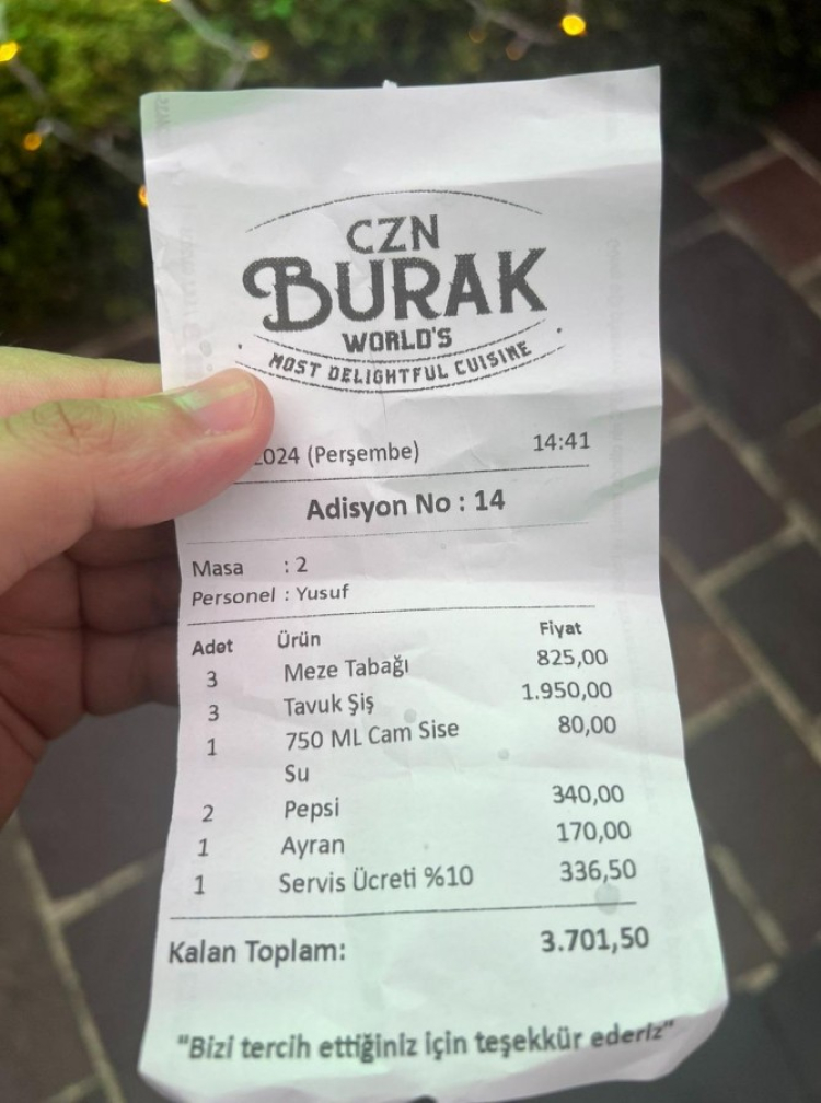 CZN Burak'ın restoranına giden 3 kişi toplam ücret 3.701,50 TL ödedi. 3 kişilik tavuk şiş 1.950 TL, meze tabağı 825 TL, cam şişe su 80 TL, ayran 170 TL olurken servis ücretinin ise 336 TL olması dikkatlerden kaçmadı.