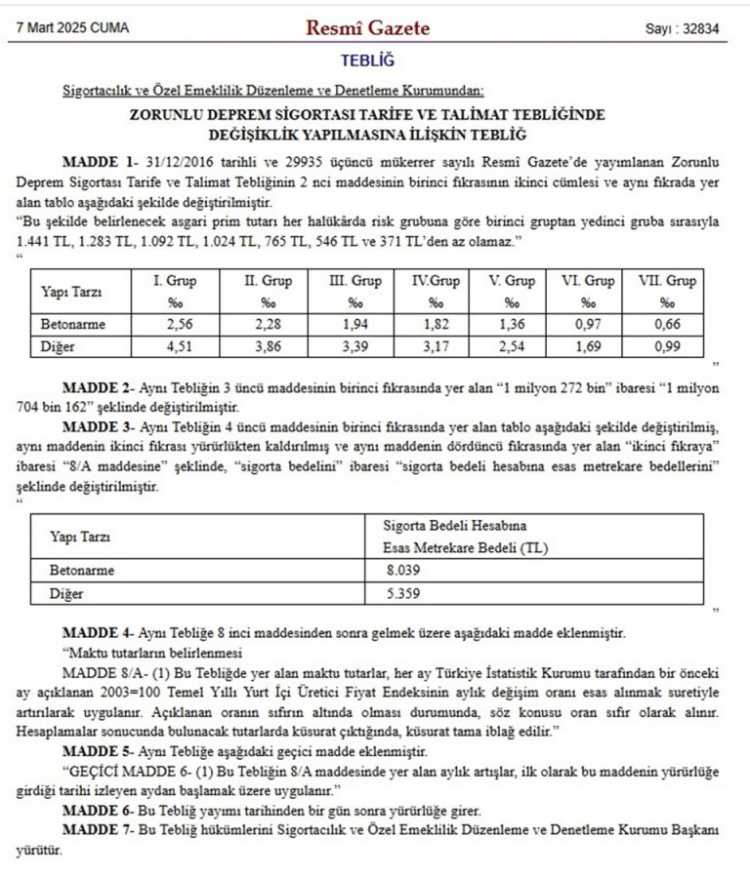 Resmi Gazete'de yayımlanan düzenlemeye göre Zorunlu Deprem Sigortası asgari prim tutarlarında da güncelleme yapıldı. Risk grubuna göre birinci gruptan yedinci gruba sırasıyla 1.441 TL, 1.283 TL, 1.092 TL, 1.024 TL, 765 TL, 546 TL ve 371 liradan az olamayacak şekilde güncellendi. Sigorta bedeli hesabına esas metrekare bedeli, betonarme konutlar için 8,039 TL'ye, diğer konutlar için 5,359 TL olarak belirlendi.