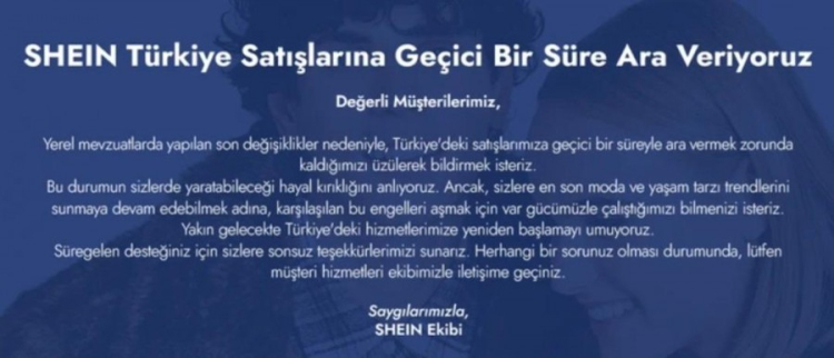 Shein, Türkiye satışlarına geçici bir süre ara verdiğini duyurdu. Kararın, yerel mevzuatlarda yapılan son değişikliklerle ilgili olduğu belirtilirken şirketin açıklamasında "Yakın gelecekte Türkiye'deki hizmetlerimize yeniden başlamayı umuyoruz" ifadeleri kullanıldı.