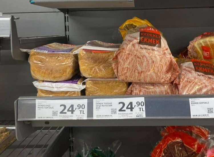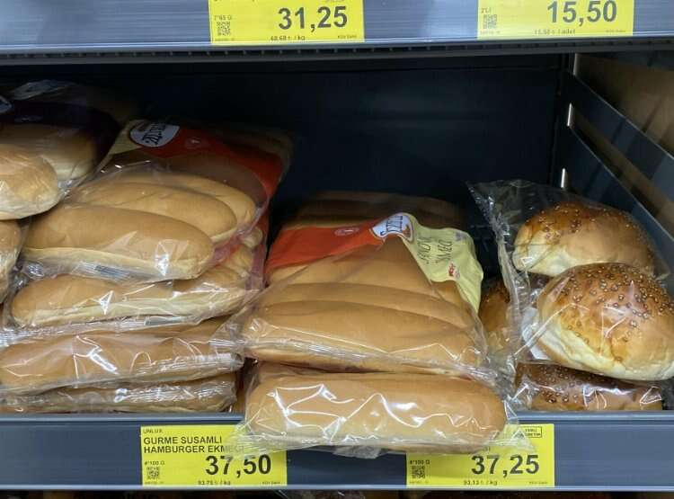 Market raflarında paket halinde satılan ekmeklerde de durum pek farklı değil. Beyaz ekmeklerin fiyatları 7 lira 50 kuruştan satılıyor. Nimet tam buğday ekmeği 20 lira, Nimet tost ekmeği 25 lira, Unlux hamburger ekmeği 37 lira 50 kuruş, Ekmecik sandviç ekmeği 31 lira 25 kuruş, Uno tost ekmeği 39 lira 95 kuruş ve Uno Anadolu köy ekmeği 28 lira olarak raflarda yerini alıyor. Uno Anadolu tam buğday tava ekmeği ise 44 lira 50 kuruştan satışa sunuluyor.