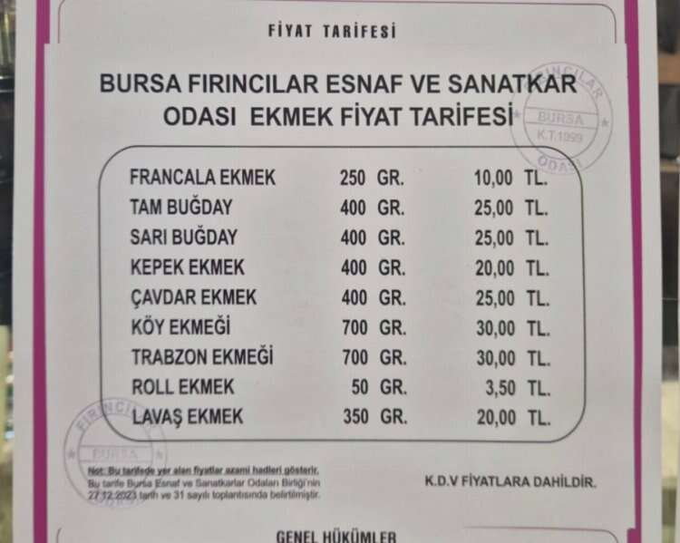 Bursa Fırıncılar Esnaf ve Sanatkar Odası'nın belirlediği ekmek fiyat listesi üçlü rakamlara ulaştı. Fırınlarda en ucuz olan roll (küçük somun ekmeği) 50 gram olarak 3,50 liradan satılıyor. Daha sonra uygun fiyatlı olarak francala (baget) ekmek ve lavaş ekmek 20 liraya satışı gerçekleşiyor. Genellikle diyet yapan insanların tercih ettiği tam buğday ekmeğin fiyatı 25 liradan satışa sunuluyor. Sarı buğday ve çavdar ekmeği de 25 liradan raflarda yerini alıyor. Köy ekmeği ve Trabzon ekmeği ise en pahalı ekmekler arasında yer alıyor. Bu iki ekmek fırınlarda 30 liraya satışa sunuluyor.