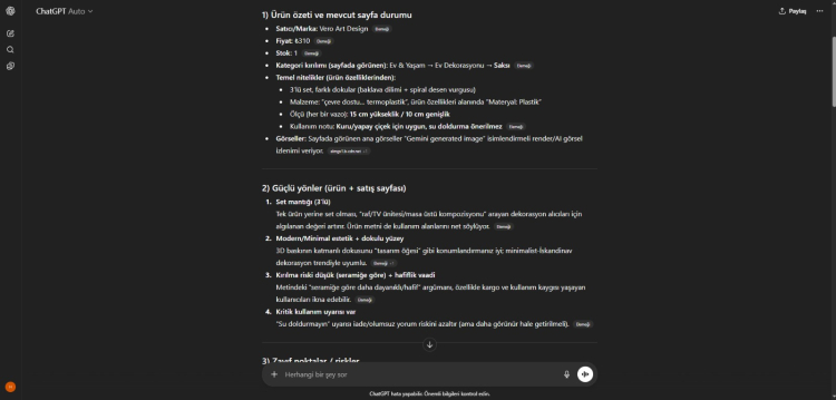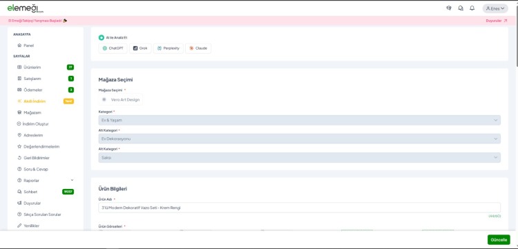 Platformda yer alan mağaza sahipleri, “AI ile Analiz Et” özelliği sayesinde ürün düzenleme sayfasından ChatGPT, Grok, Perplexity AI veya Claude platformlarından birini seçerek ürünleri hakkında kapsamlı değerlendirme alabiliyor.