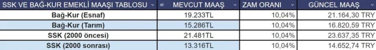 SSK ve Bağ-Kur emeklisinin ise 3 aylık enflasyon farkına göre maaş tablosu şu şekilde oluştu: