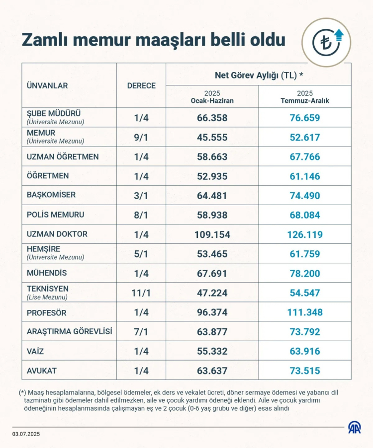 Yeni zamlarla birlikte en düşük memur maaşı 43 bin 726 liradan 50 bin 503 liraya yükseldi.