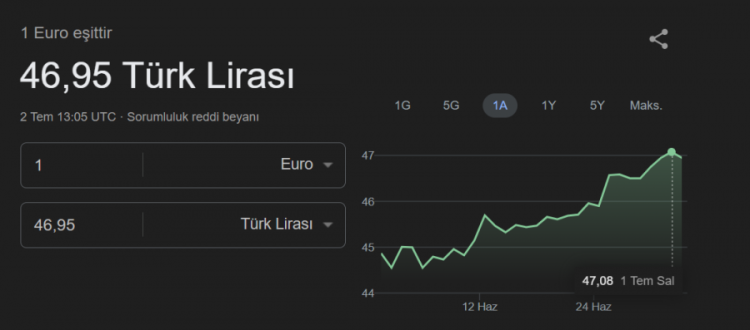 Euro kuru bugün 47.1987 lirayla tarihi yüksek seviyesine ulaştı. Şu sıralar 46.9430 liradan işlem görüyor.