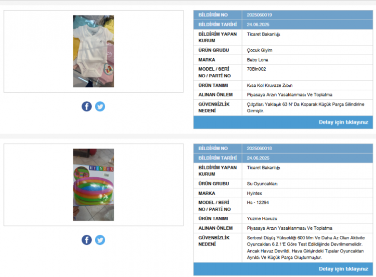 Ticaret Bakanlığı, çocuk güvenliğinitehdit eden ürünlere karşı denetimlerini sürdürüyor. Bakanlığın Güvensiz Ürün Bilgi Sistemi (GÜBİS) üzerinden 24 Haziran 2025 tarihinde yayımlanan bildirimlerde, biri tekstil biri oyuncak olmak üzere iki farklı ürün için toplatma kararı alındı. Ürünlerin piyasadan toplatılması ve arzının yasaklanması talimatı verildi.