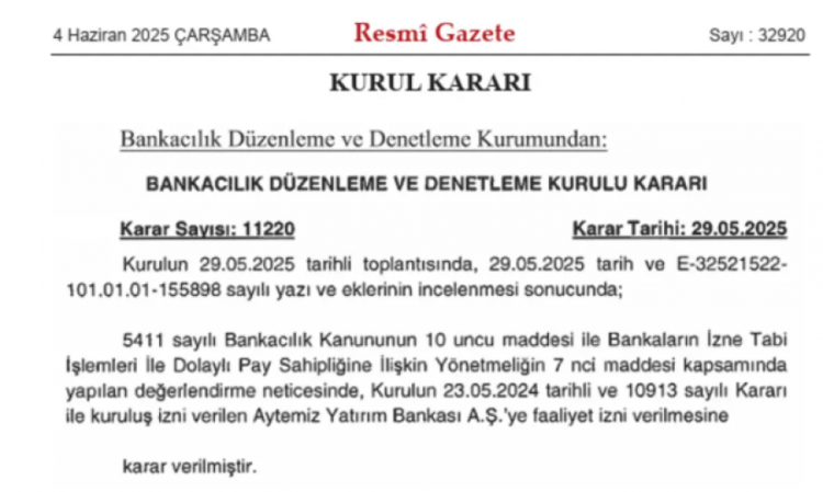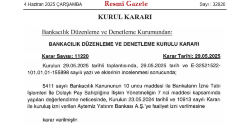 Resmi Gazete'de yayımlandı iki yeni banka geliyor. Bankacılık Düzenleme ve Denetleme Kurulu (BDDK), Aytemiz Yatırım Bankası A.Ş.'ye faaliyet izni verilmesine karar verdi.