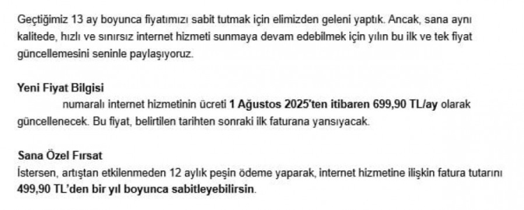 İnternet hizmetinin ücreti 1 Ağustos 2025'ten itibaren 699,90 TL/ay olarak güncellenecek. Bu fiyat, belirtilen tarihten sonraki ilk faturana yansıyacak."