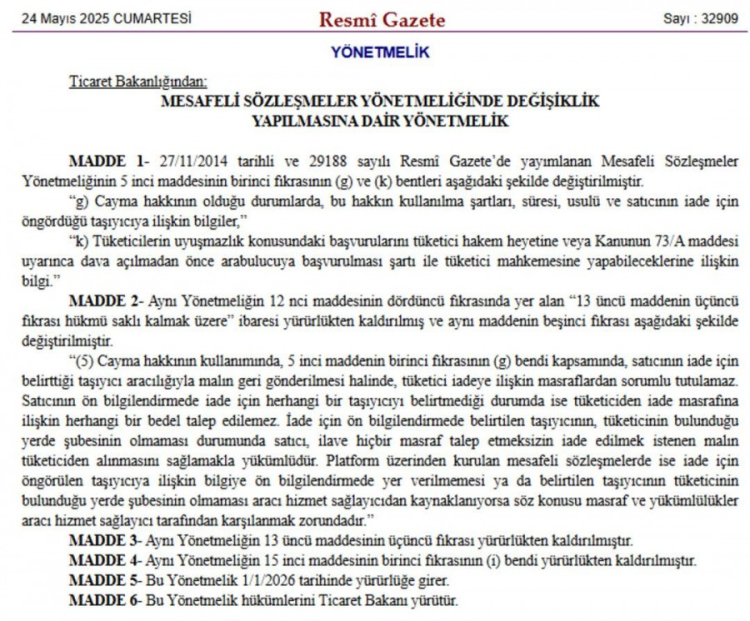 Resmi Gazete'de yayımlanan düzenleme ile bereber Mesafeli Sözleşmeler Yönetmeliğinde yeni değişimler yapıldı. Ticaret Bakanlığı tarafından yapılan düzenlemeler ile beraber tüketicilerin iade masrafı öderken mağdur edilmesinin önüne geçilecek ve e-ticaret platformları da daha fazla sorumluluk üstlenmek zorunda kalacak.