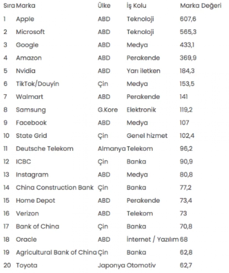 Söz konusu listede ABD şirketi Amazon yaklaşık 369,9 milyar dolarla 4'üncü, ABD şirketi Nvidia 184,3 milyar dolarla 5'inci, Çinli şirket Tiktok 153,5 milyar dolarla 6'ncı, ABD'li perakende şirketi Walmart 141 milyar dolarla 7'nci, Güney Koreli Samsung 119,2 milyar dolarla 8'inci, ABD'li Facebook 107 milyar dolarla 9'uncu, Çinli State Grid 102,4 milyar dolarla 10'uncu oldu.