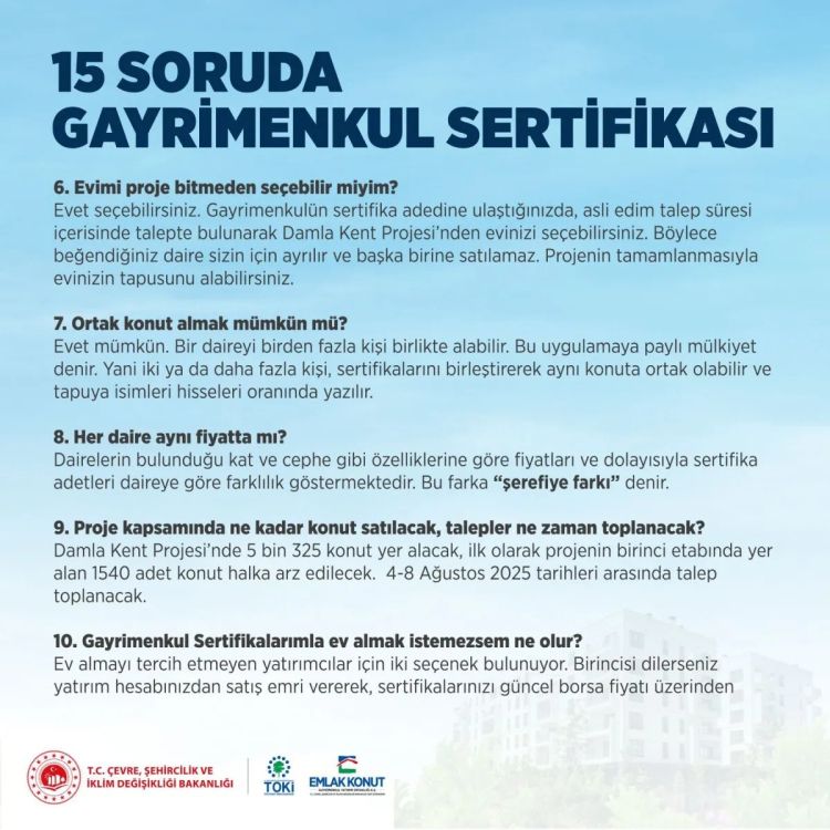 Çevre, Şehircilik ve İklim Değişikliği Bakanı Murat Kurum, kamuoyunda ilgi gören Gayrimenkul Sertifikası modeliyle ilgili merak edilen soruları ve cevaplarını sosyal medya hesabından “Görüyorum ki; dün açıkladığımız küçük birikimlerle ev alma projemize ilgi büyük ve merak edilen birçok konu var. İlk olarak İstanbul’da başlattığımız Gayrimenkul Sertifikasıyla ilgili 15 soru 15 cevap burada” notuyla paylaştı.