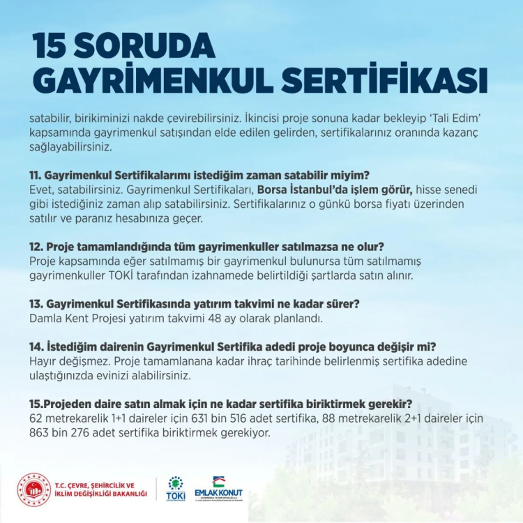 Gayrimenkul sertifikaları Çevre, Şehircilik ve İklim Değişikliği Bakanlığına bağlı TOKİ ve Emlak Konut güvencesindedir.