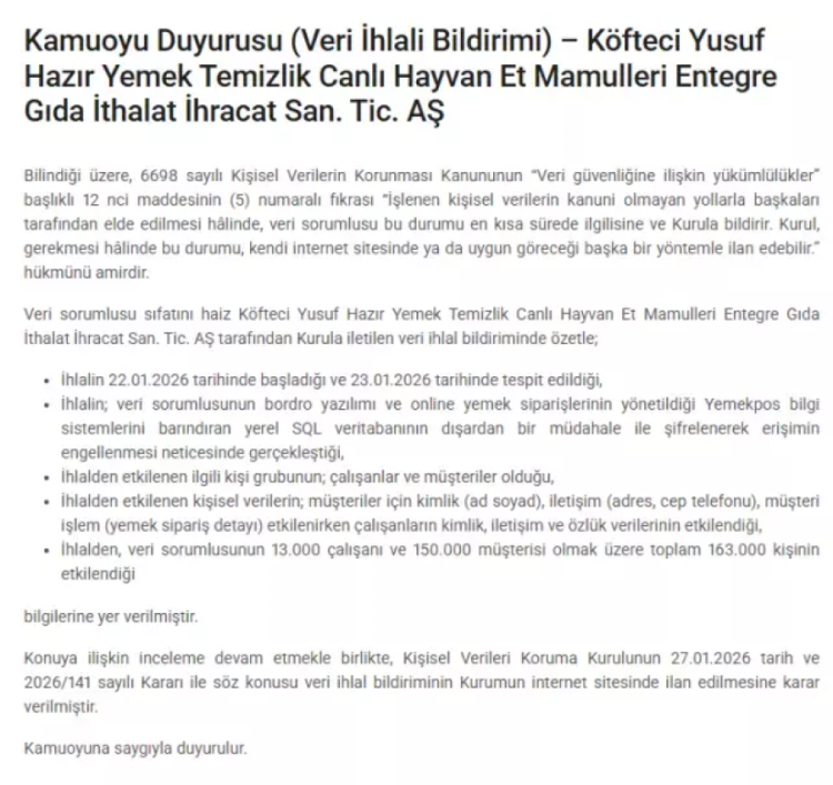 KVKK, Köfteci Yusuf'un bilgi sistemlerine yapılan siber saldırı sonucu 13 bin çalışan ve 150 bin müşteri olmak üzere toplam 163 bin kişinin kişisel verilerinin ihlal edildiğini duyurdu. Müşterilere ait ad soyad, adres, cep telefonu ve yemek sipariş detayları; çalışanlara ait ise kimlik, iletişim ve özlük bilgilerinin ihlal kapsamında yer aldığı belirtildi.
