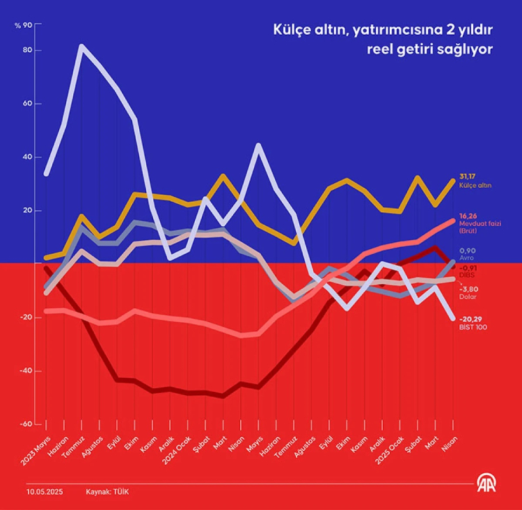 Tüm bu küresel gelişmelerle birlikte TÜİK tarafından reel getirileri incelenen finansal yatırım araçları arasında da külçe altının diğer yatırım araçlarından ayrışması dikkati çekti.