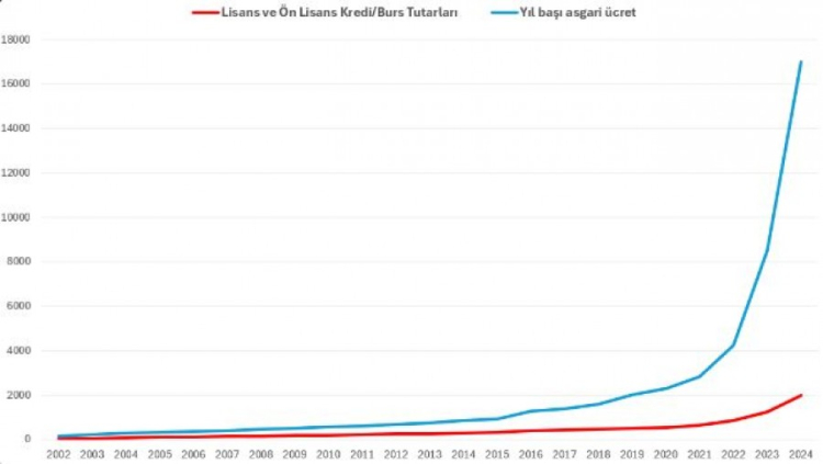 2004 yılından burslardaki artış 2.122 oranında olurken, asgari ücretle karşılaştırıldığında 20 yılda asgari ücretin yüzde 5.510 oranında arttığı görülüyor.