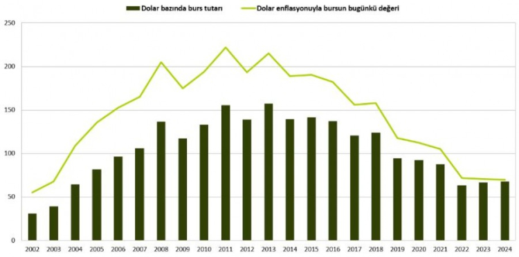 2005 yılında 110 TL olan KYK bursundaki artış yüzde 1.718 olurken, TÜFE eğitim harcama kalemindeki artış yüzde 1.774 olarak karşımıza çıkıyor.