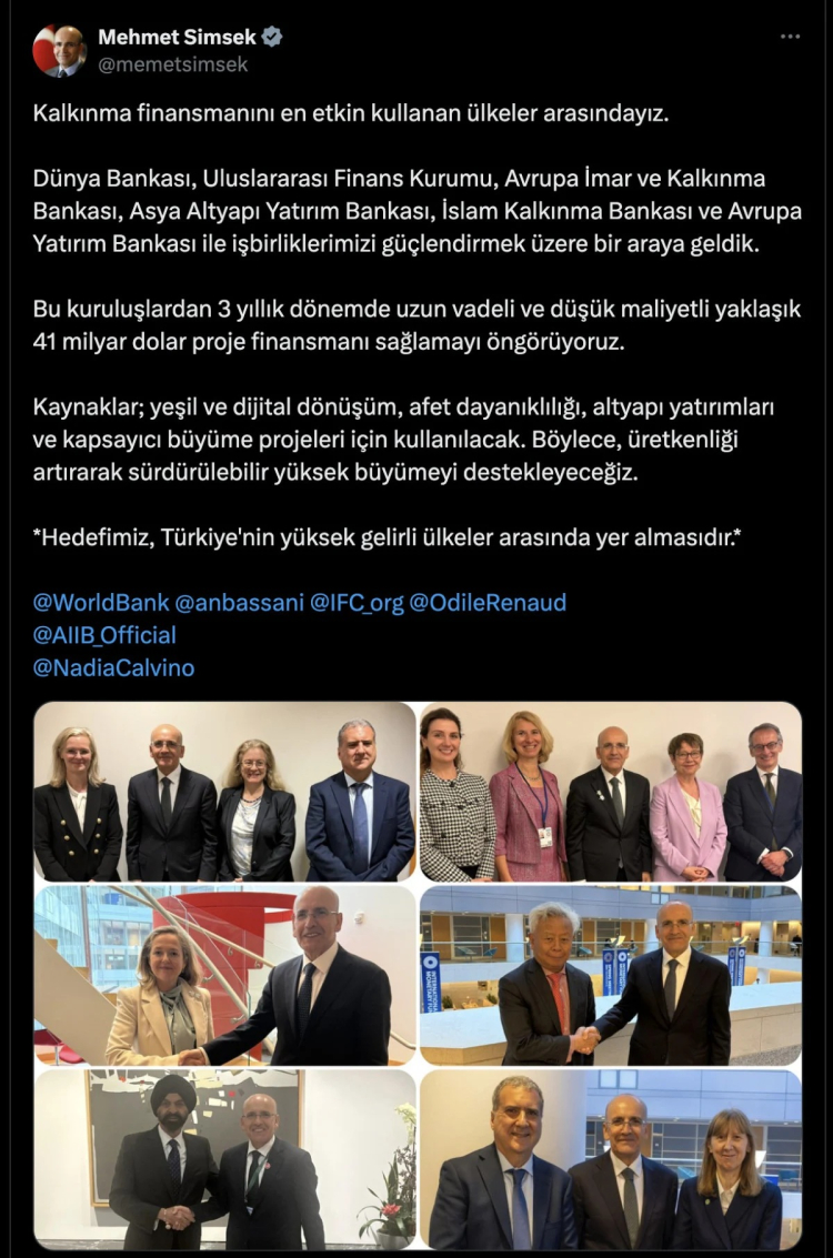 Hazine ve Maliye Bakanı Mehmet Şimşek, 6 uluslararası finans kuruluşuyla yapılan görüşmeler sonrasında, önünmüzdeki 3 yıl için 41 milyar dolar proje finansmanı sağlamayı öngördüklerini belirtti.