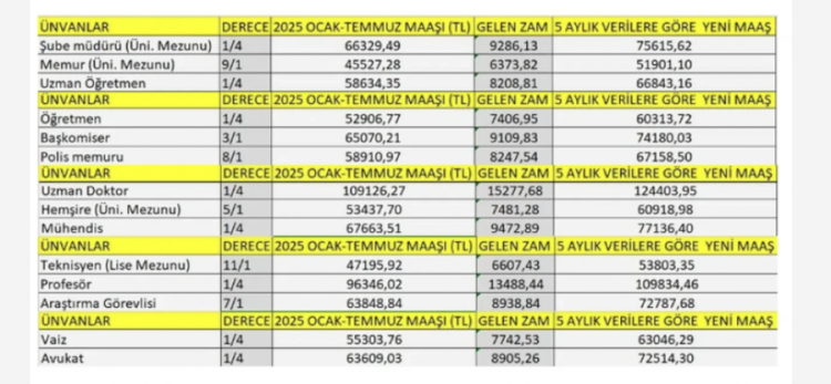 Kamu kurumlarında öğretmen, doktor, polis, avukat, profesör, araştırma görevlisi, hemşire, mühendis, üniversite mezunu memur gibi mesleklerin 5 aylık zamlı maaşları hesaplandı.