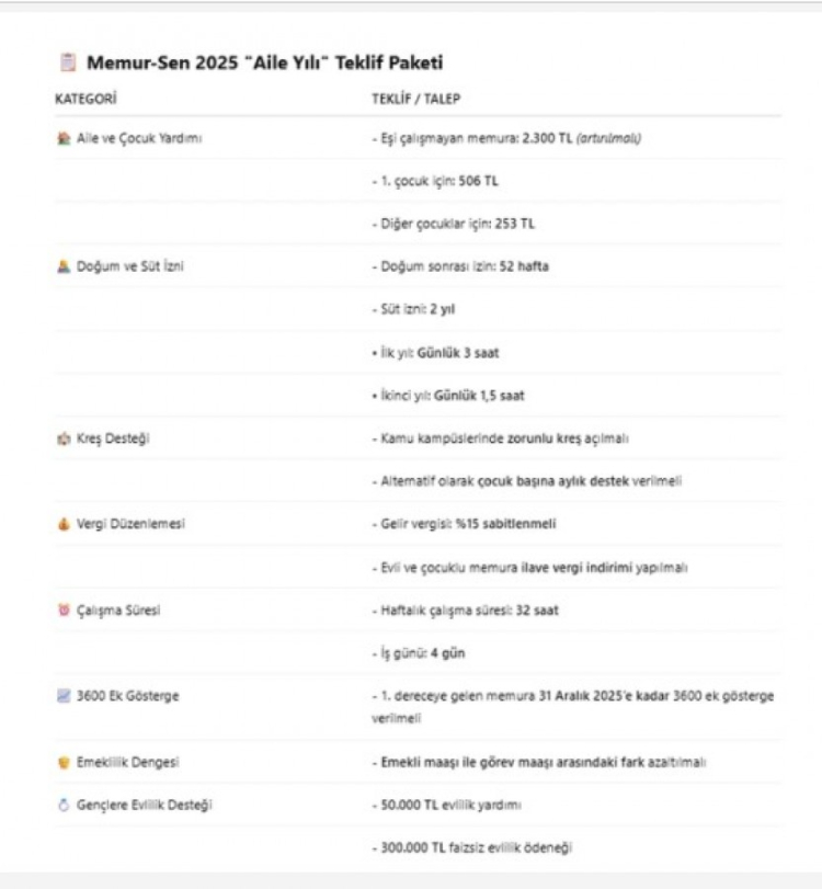 Memur-Sen Konfederasyonu'nun 2025 yılını "Aile Yılı" ilan etmesi ve kamu görevlilerinin aile hayatını desteklemeye yönelik sunduğu 13 maddelik teklif paketi, kamu çalışanlarının sosyal ve ekonomik şartlarını iyileştirmeyi hedefliyor. Pakette doğum sonrası ve süt izni, maddi destek, evli ve çocuklular için vergi indirimi gibi maddeler bulunuyor.