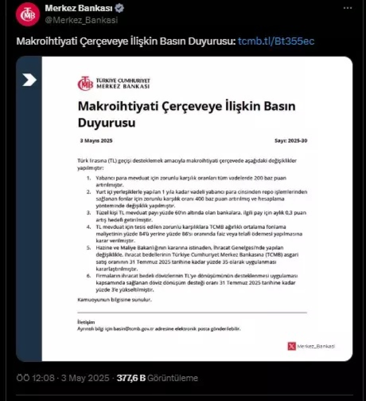 Türkiye Cumhuriyet Merkez Bankası (TCMB), Türk lirasına geçişi desteklemek amacıyla makroihtiyati çerçevede önemli düzenlemeler gerçekleştirdi. 3 Mayıs 2025 tarihli duyuruya göre, dövizden TL'ye geçişi teşvik etmeye yönelik alınan kararlar hem bankaları hem de ihracatçı firmaları yakından ilgilendiriyor.
