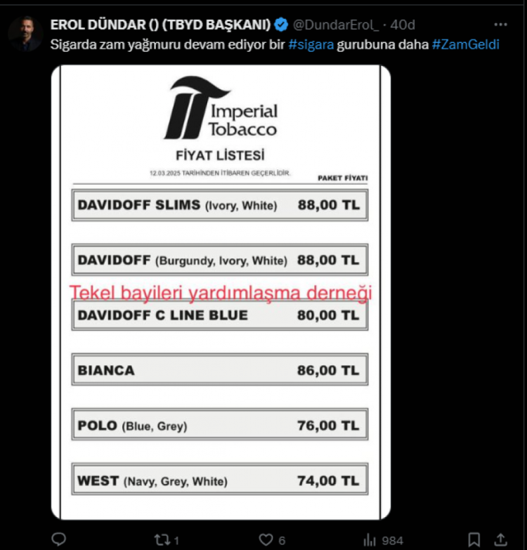 Tekel Bayileri Yardımlaşma Derneği Başkanı Erol Dündar, zam sonrası Imperial Tobacco grubundaki en ucuz sigaranın 74 TL, en pahalı sigaranın ise 88 TL'ye çıktığını açıkladı.