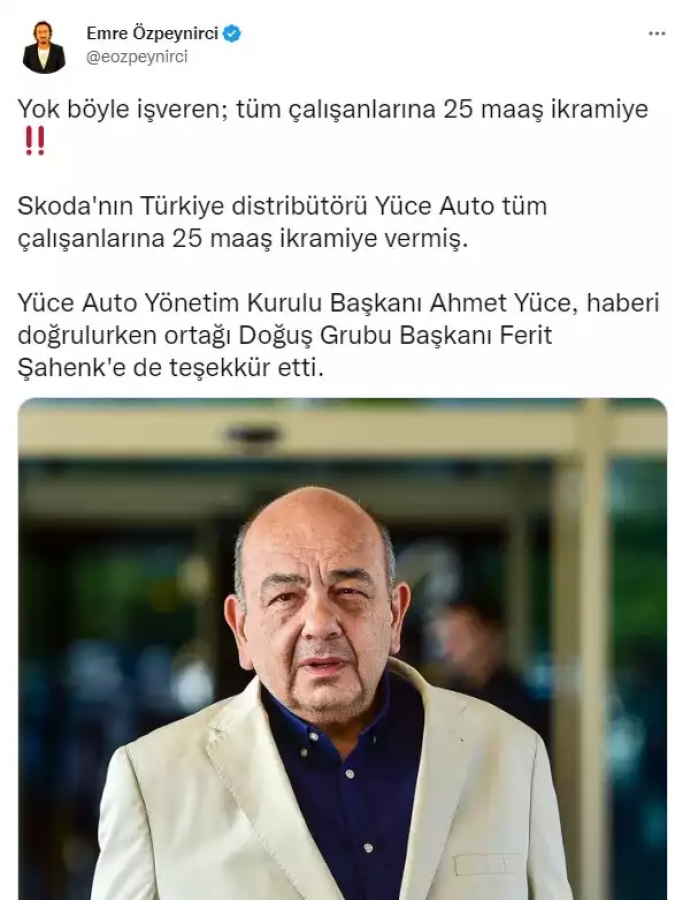 Gazeteci Emre Özpeynirci Skoda'nın Türkiye distribütörü Yüce Auto tüm çalışanlarına 25 maaş ikramiye verdiğini duyurdu.