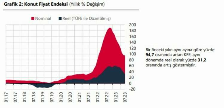 TCMB verilerine göre, konut fiyatları 2023 Temmuz ayında yıllık bazda yüzde 94,7 arttı. Böylece yıllık artış hızında gerileme temmuzda sürdü. Türkiye genelinde ortalama konut fiyatı ise 2,63 milyon TL oldu.