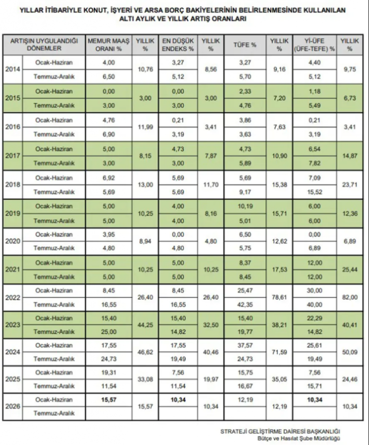 TOKİ tarafından inşaa ettirilen ve bir önceki altı aylık memur maaş artış oranına bağlı olarak satışa sunulan yeni projelerin, geri ödemelerine esas borç bakiyeleri ve taksit bedelleri, bir önceki altı aylık dönemdeki (1 Temmuz 2025- 31 Aralık 2025 dönemi) memur maaş artış oranı ile güncellenecek olup, bu oran yüzde 15,57 olarak belirlendi.