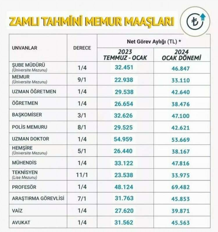 KABUL EDİLEN ZAM ORANLARI İLE MEMURLARIN ALACAĞI TAHMİNİ OCAK 2024 MAAŞ ZAMMI TABLOSU ŞÖYLE OLDU