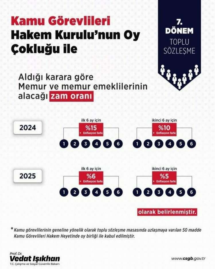 Yaklaşık 4 milyon memur ve 2,5 milyon memur emeklisini ilgilendiren toplu sözleşme süreci Hakem Heyeti sürecinin nihai kararı vermesi ile son buldu. Memur zammı ve memur emeklisi zammı için 2024 ve 2025'te yapılacak artış oranlarını belirlemede iki kriterden biri olan 7. Dönem Toplu Sözleşme zammı oranları resmen belli oldu. Kurulun verdiği karara itiraz edilemeyecek.